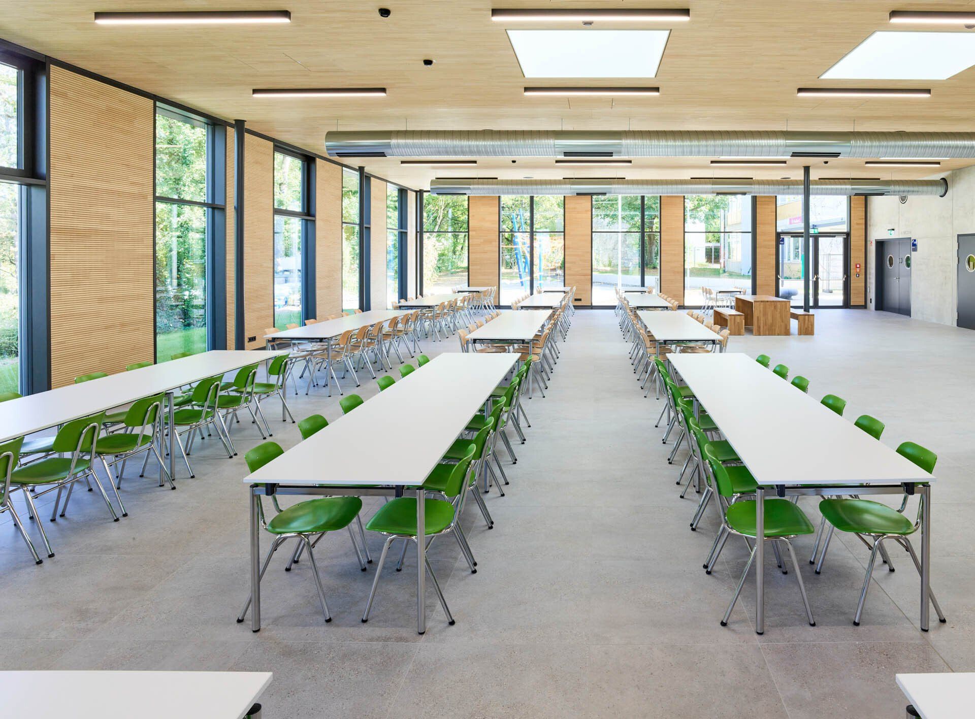 Im Speisesaal ist die umlaufende Glasfassade so konzipiert, dass die Fensterflächen zur Straßenseite hin kleiner sind und dann in Richtung Schule immer größer werden. Es entsteht ein dynamischer Verglasungsverlauf der den Saal in Richtung Straße abschirmt und zur Schule hin zunehmend öffnet.