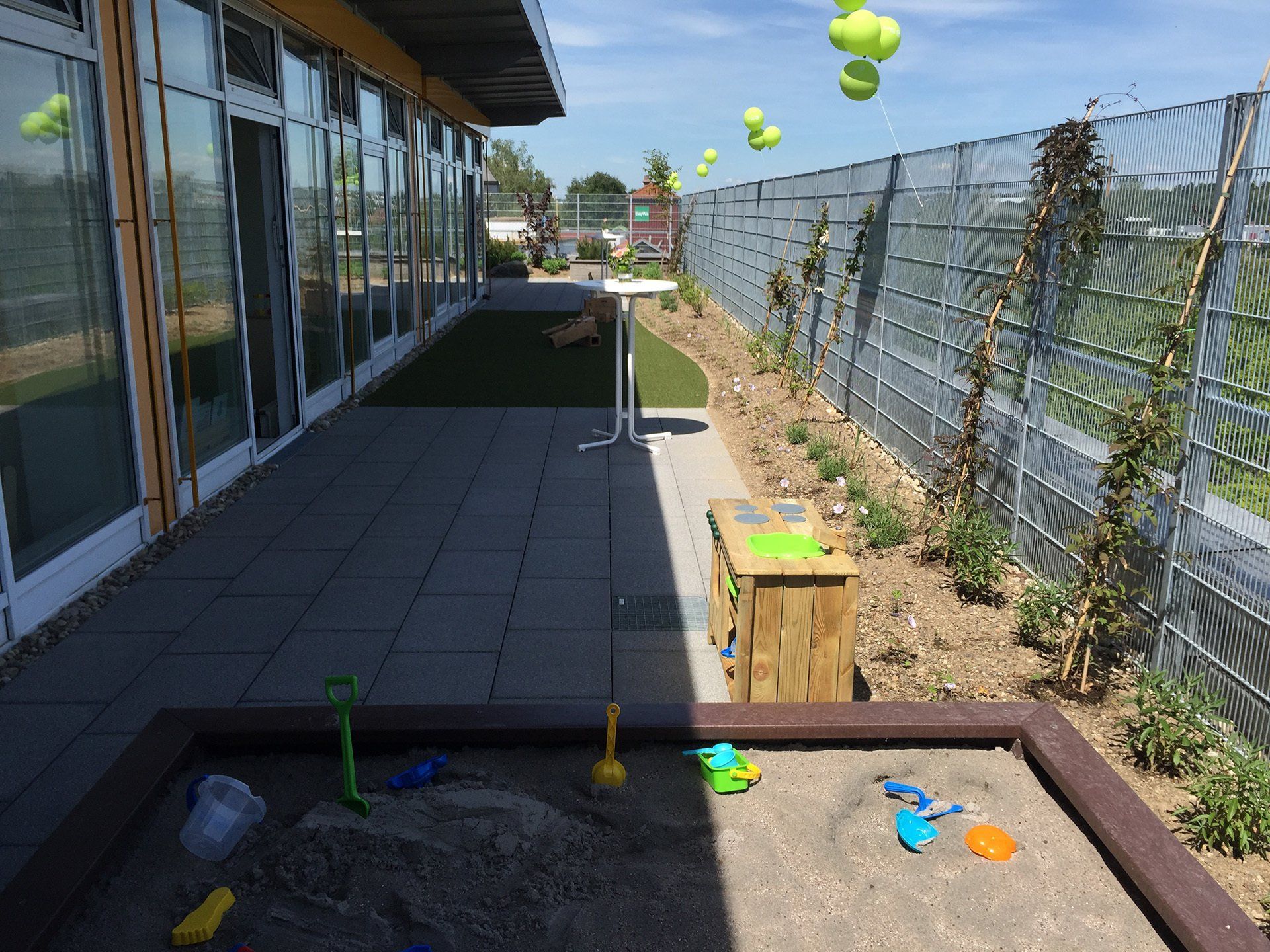 Das 3. Obergeschoss der Clemens Schule war noch ungenutzt. Da ein großer Bedarf an Kinderbetreuung besteht, entschied sich die Schulleitung dieses Geschoss zu einer KITA auszubauen. Die ehemaligen Büroräume wurden neu organisiert, Gruppenräume, Schlafräume, ein Atelier, sowie ein offener Essensbereich wurden geschaffen. Als Außenfläche war glücklicherweise eine umlaufende große Dachterrasse vorhanden, die zum Spielbereich umgestaltet wurde. Große Markisen sorgen für ausreichend Schatten. Mit dem hohen Stabmattenzaun ist die Sicherheit gewährleistet.